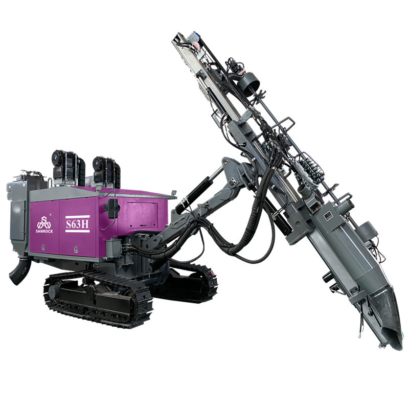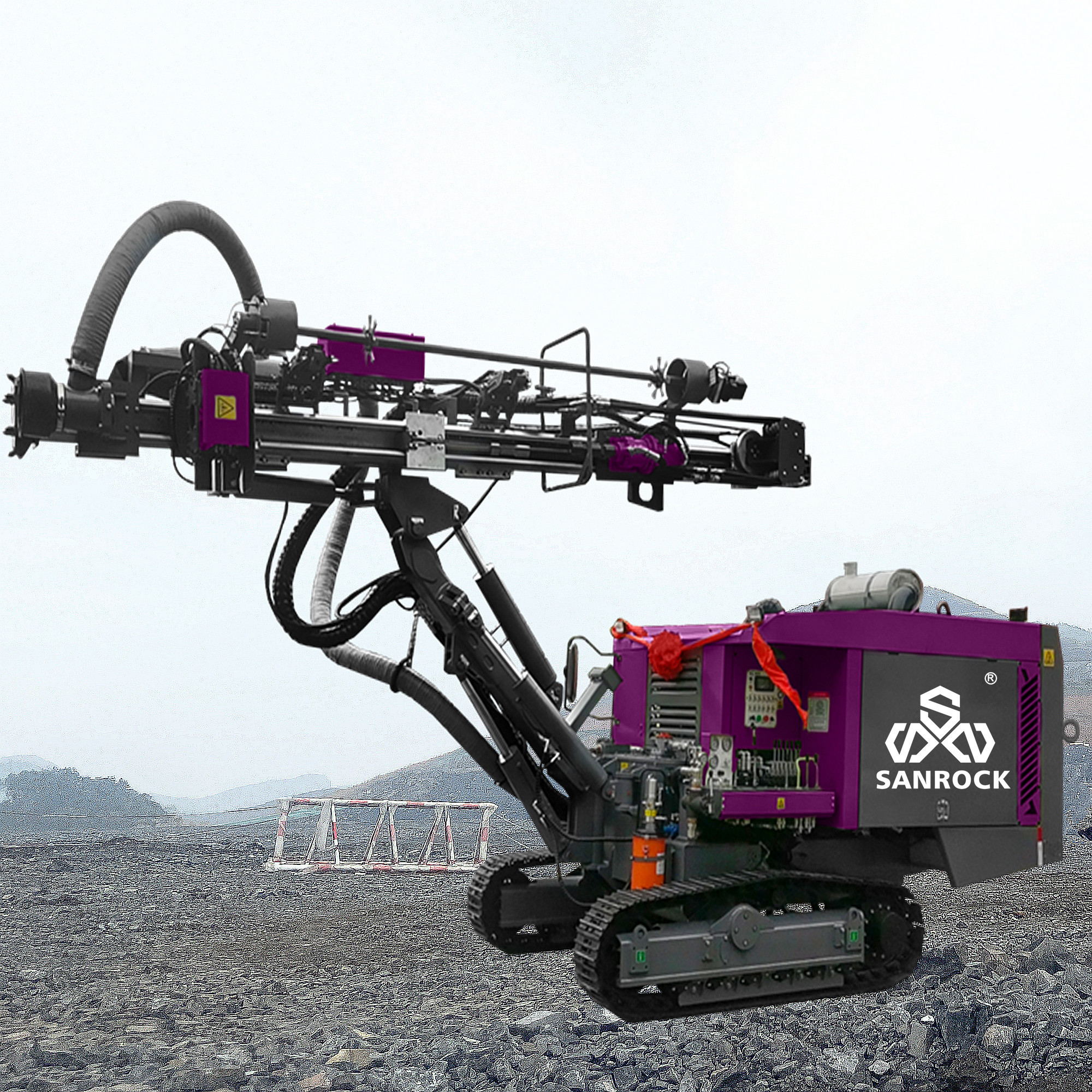 The drilling rig is characterized by excellent integrity and compact design structure. Optional installation of automatic rod change,configuration dry dust collectors environmental protection. High degree of automation, efficient drilling, simple operation, flexible maneuverability, single operator for labor cost. Sanrock automatic drilling rig with rod changing system, powerful feeding and rotation design for less jamming in complex rock situation,hefficient High efficiency drilling speed. Can easily cope with all kinds of drilling angel requirement of landscapes. The advantageous functions such as precise boom positioning,automatic rod handling.