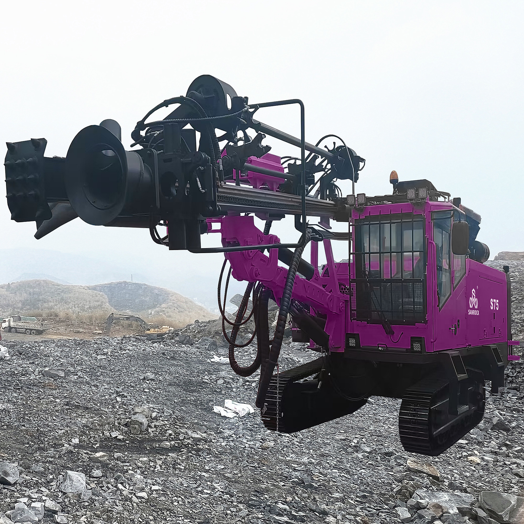 The drilling rig is characterized by excellent integrity and compact design structure. Optional installation of automatic rod change,configuration dry dust collectors environmental protection. High degree of automation, efficient drilling, simple operation, flexible maneuverability, single operator for labor cost. Sanrock automatic drilling rig with rod changing system, powerful feeding and rotation design for less jamming in complex rock situation,hefficient High efficiency drilling speed. Can easily cope with all kinds of drilling angel requirement of landscapes. The advantageous functions such as precise boom positioning,automatic rod handling.